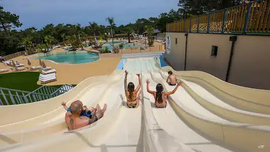 If you are looking for a French campsite with water park, the Côte d’Argent’s heated swimming area in Hourtin should meet your expectations! With its pools, aqua fun areas and slides, there is something for everyone! Younger and older people can look forward to a huge heated water area of around 9,000 m², which is suitable for all wishes and all ages.